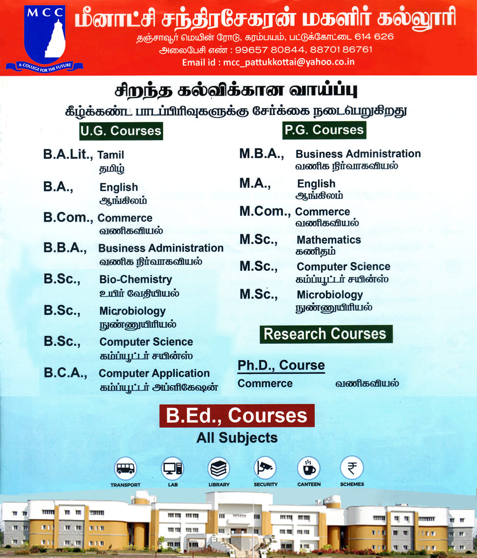 Meenakshi Chandrasekaran College of Arts & Science (Women), Karambayam, Pattukottai is a well-known Arts and Science College for Women in the fertile Cauvery delta region of Tamil Nadu namely Karambayam, Pattukkottai. It has been at the forefront of women's education for the past 23 years and is approaching its silver jubilee year.